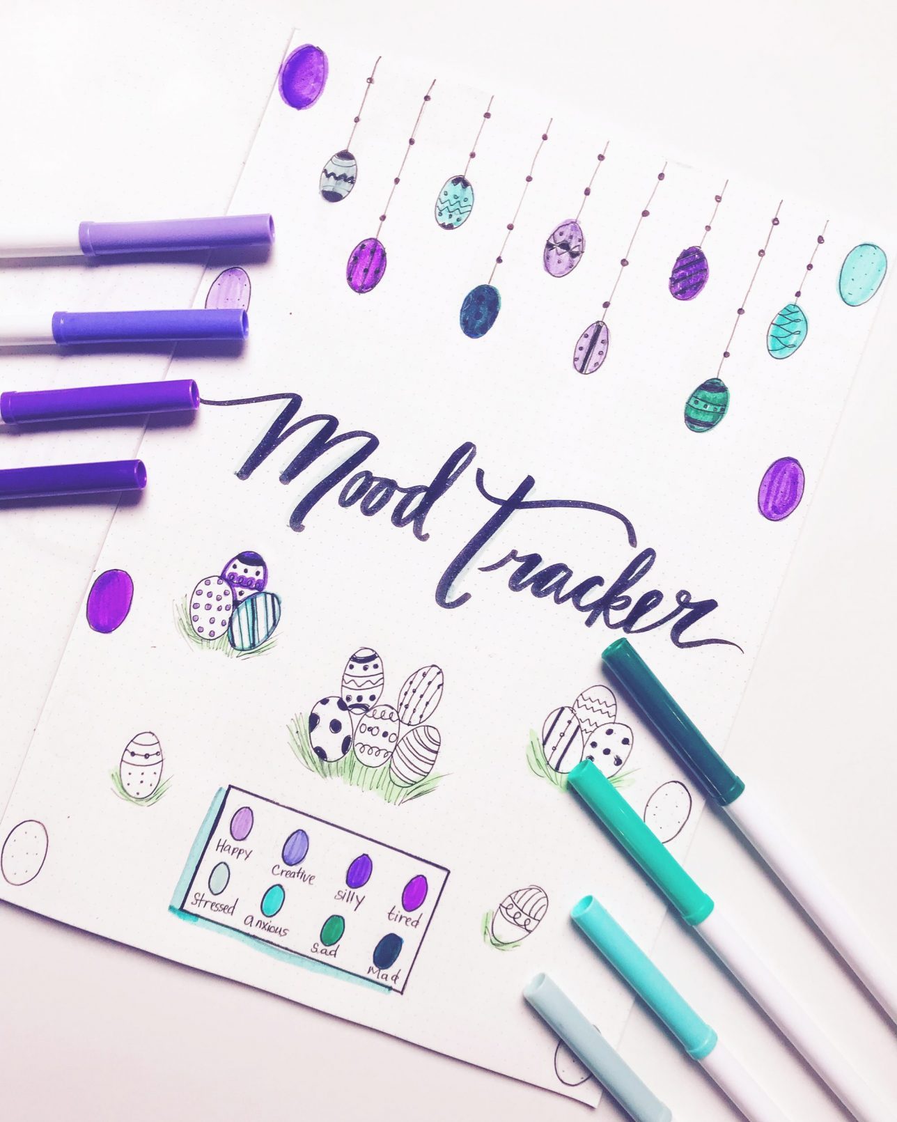 April’s mood tracker is a beautiful Easter egg theme! I used different shades of purple and turquoise to represent my moods this month. The 8 moods featured on this month’s tracker are: happy, creative, silly, tired, stressed, anxious, sad and mad.