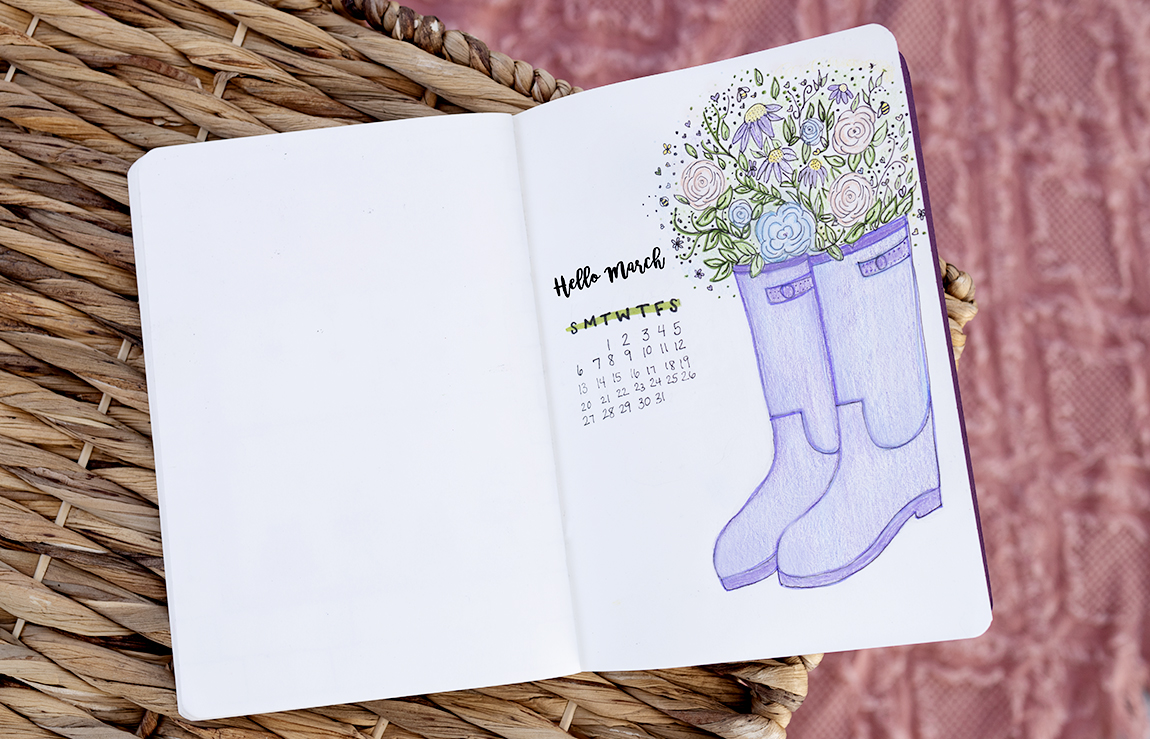 I have a pair of rain boots for every season but my lavender ones are my all-time favorite! These are the inspiration for March’s cover page in my bullet journal. I added some spring florals because I love when spring is in full bloom! I’m always so inspired by nature and all the beauty it gives to us. It’s always fun to find a way to incorporate it into my designs.